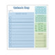 Practical notepad to help you keep track of your daily habits, making sure you drink enough water, stretch at least once every hour during an eight-hour work day, take the number of steps you need, and remember to take your meds or vitamins! There's also a handy to-do list with ten checkboxes so you can make your daily to-do list and check off each task you've finished. At the top, add your name in a bold blue font. The daily habits tracker is printed in different shades of blue and green, from a light sky blue to olive green.