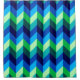 A shower curtain featuring a colourful, ombre pattern design of chevrons in lime green, royal turquoise, ocean blue and sky blue.
