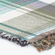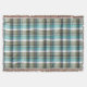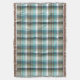 This cosy throw blanket features a traditional turquoise, tan, and white tartan plaid image.