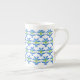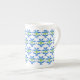 A stylish Bone China Mug with an Art Nouveau pattern in bright blue, green and White, from a handpainted design by Judy Adamson.