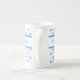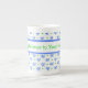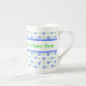 A pretty, customisable bone china coffee mug, with a pattern of bows and spots in blue and green on a white background from a handpainted design by Judy Adamson.! Coordinating tea pot and pitcher also available.