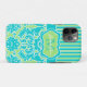 This modern, personalised, turquoise blue, green, and white stripes with damask Case-Mate iPhone 11 Case has spots for you to add your name and monogram. If you need help customising this, please email niteowlstudio@gmail.com.