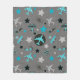 This fun kids fleece blanket has blue, black, and grey aeroplanes flying all over it! There are two styles of planes in different patterns and colours. Among the planes are blue, black, and grey stars. At the centre is a blue aeroplane framed in a black circle. Everything is placed on a medium grey background. Any boy who loves planes and flying will love this blanket!