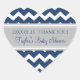 Baby shower thank you favour tag sticker in elegant and fun dark navy blue, grey, and white chevron zigzags pattern. Customisable with your own text, contact us for a colour change. The perfect way to decorate your baby shower favours and thank your guests for being a part of your special day.