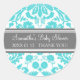 Baby shower thank you favour tag sticker in elegant bright turquoise aqua blue, grey and white classic floral damask pattern. Customisable with your own text, contact us for a colour change. The perfect way to decorate your baby shower favours and thank your guests for being a part of your special day.