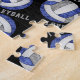 This volleyball pattern jigsaw puzzle for girls features a larger blue, grey and white artsy, stylised volleyball, upon which her name and jersey number can be personalised, overlying a pattern of smaller blue, grey and white volleyballs on a black background and "I love volleyball" varsity-letter-style text in grey stretching between the angled rows of volleyballs - by katz_d_zynes