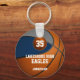 This boys' basketball team colours keychain with easily customisable player name plus school and team mascot name features a simple basketball graphic with blue and grey school colours - the player's jersey number is on a tiny basketball - by katz_d_zynes | See more basketball team colour combinations in katzdzynes’ collection “Basketball keychains and backpacks for boys” >>> https://www.zazzle.com/collections/119832025911486781