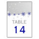 Blue, silver grey, white snowflake modern wedding table number place card, featuring stars and elegant blue snowflakes on grey. Text in blue and grey. A stylish design perfect for your winter, December or Christmas wedding. Fold it along the dotted line to have a tent style folded place card.