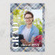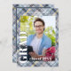Unique and trendy congratulations graduate announcement and celebration part invitation card, framed with a stylish grey, light and dark blue, coral red, yellow and white coloured plaid tartan pattern background. With room to customise or personalise with a photo, the name of the graduate, class graduation year, high school, future college or university name, and celebration party event information. Let the family, friends and neighbours know there is a happy graduate ready to conquer the world, and invite everybody to come celebrate the happy event with you!