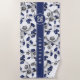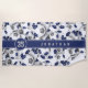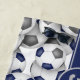 This soccer themed beach towel for boys or girls features a random pattern of varied size stylised soccer balls turned every which way on a customisable white background - the typically black panels on each soccer ball have been recolored blue & grey - personalise with the athlete's name and jersey number - by katz_d_zynes