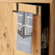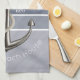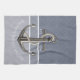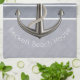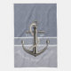 This blue grey toned, nautical style dish towel, features two types of pinstripes and a realistic looking anchor with white rope wrapping around it. Text is customisable.