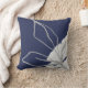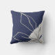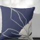 Modern throw pillow features a minimalist artistic watercolor botanical leaf design in a blue and grey colour palette. This artistic composition is constructed from a simple illustration of organic leaves with a simple watercolor Memphis style design element in the lower right hand corner; a stylish botanical design. The grey design elements compliment the navy blue background.
