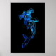 a decorative artwork of a hammerhead shark swimming along in surreal blue colours on a black background as a poster print.