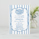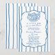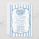 Designed in a blue and white color palette, this invitation features vertical stripes, a softly scalloped frame, and an adorable hand-drawn bread basket illustration that brings the beloved bun in the oven theme to life. The mix of elegant script and clean serif typography creates a balanced look that feels warm, welcoming, and perfect for both modern and traditional celebrations.