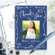 Make sure your favorite grad shows appreciation to all who supported their milestone event! Send out this quirky, playful, simple, modern, personalized photo thank you card. On the front, fun white handwritten script typography and hand drawn graduation icon sketch doodles, along with your custom photo, overlay a navy blue background. Add the photo of your choice and personalize the custom text with your grad’s name, and class year. On the back, type in your custom message or delete the copy altogether so you can write your own handwritten note. Matching invites, address labels, banners, stickers, hand fans and other graduation goodies are also available in this trendy and stylish collection. Guaranteed to add a stylish touch to their correspondence!