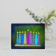 “Peace, love & light.” A playful, modern, artsy illustration of boho pattern candles in a menorah helps you usher in the holiday of Hanukkah. Assorted blue candles with colourful faux foil patterns overlay a rich deep green textured background. On the back, type in your personal copy using the easy template provided or delete altogether for your handwritten note. Feel the warmth and joy of the holiday season whenever you send this stunning, colourful, personalised Hanukkah greeting postcard. Matching envelopes, stickers, tote bags, wrapping paper, serving trays, home décor, and more are also available. Send this to someone special!