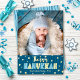 “Happy Hanukkah.” Fun, playful, whimsical handcrafted real gold foil and light blue typography, a random gold foil Star of David pattern, and midnight navy blue hand drawn lines overlay a dark teal blue background. Add the photo of your choice and help usher in Hanukkah with this stunning, colourful, personalised real gold foil greeting card. Hand drawn dark blue lines overlay a light turquoise blue background on the back. Your choice of gold, silver, or rose gold real foil. Feel the warmth and joy of the holiday season whenever you send this festive greeting. Matching stickers, pillows, wrapping paper, serving trays, home décor, and more are also available. Make this Hanukkah one to remember!