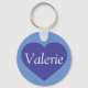 This keychain features a shapely blue heart on a dark blue background overlaid by customisable text. Change "Valerie" to whatever text you choose.