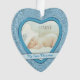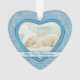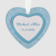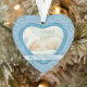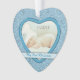 This holiday keepsake ornament features your own baby photograph framed in a pretty blue heart frame lined in silver. The heart frame is bordered with a matching blue floral swirl pattern. A lighter blue banner holds your customised text; make it say whatever you'd like! The back of the ornament has the same blue floral swirl pattern border and heart shaped frame with additional text on the inside. This makes a nice keepsake gift for new parents.
