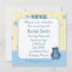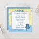 A cute, blue teddy bear with a little blue love heart on its chest sits at the corner of the white text square at the centre of this baby shower invitation. The word “BABY” is spelled out in blue alphabet blocks at the top edge of the square. Around the outside is a background of pale yellow stripes with baby blue and baby pink stars and a wide blue border along the bottom edge. All customisable text can easily be changed to suit your own needs. From my original digitally created image.