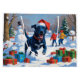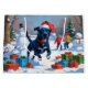 A heartwarming holiday illustration featuring a cheerful dog playing in the snow, wearing a Santa hat and surrounded by colourful gift boxes. In the background, children build a snowman beside a snow-covered Christmas tree, creating a joyful winter wonderland. Perfect for spreading holiday cheer and capturing the magic of Christmas.