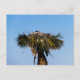A beautiful blue heron bird sits in its nest on top of a palm tree against a beautiful blue cloudless sky in Florida