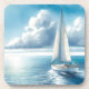 A serene coastal watercolor portraying a solitary sailboat gliding across calm blue waters beneath expansive, cloud-filled skies. Soft gradients of aqua, cerulean, and sunlit white create a tranquil rhythm, while gentle reflections ripple across the sea, evoking quiet movement and open possibility. The composition feels airy and contemplative, balancing vast sky and water with a sense of peaceful journey and timeless escape. This artwork captures a soothing coastal mood rooted in calm, freedom, and light, perfect for those drawn to breezy horizons and reflective moments by the sea. AI generated artwork.