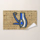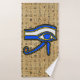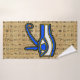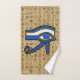 Bath towel set with the Ancient Egyptian symbol, the Horus eye on Hieroglyphs. This design features the Horus Eye in blue, yellow and black outlines on top of a Hieroglyphs background.