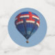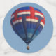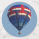 A red, white and blue hot air balloon soars in the clear blue sky.