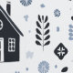 Rustic house pattern with dark houses and funny blue flowers on light grey background.