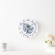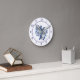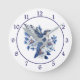 On this pretty clock, a blue hummingbird flits around white and gold flowers with blue leaves. Dark blue numbers make the clock easy to read, and a thin matching blue circle frame separates the inside floral and bird image from the numbers. Everything stands out on a crisp white background. This is an attractive clock for any room, but especially in a kitchen, breakfast or sun room.