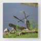 A blue huron stands on the shore of the Mississippi River, panting to keep cool on a hot summer day.