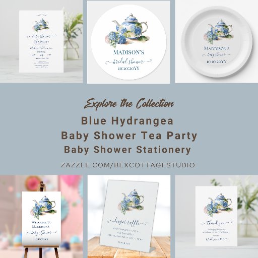 This elegant blue hydrangea baby shower tea party theme is perfect for a spring or summer event. The classic floral design features soft powder blue watercolor hydrangeas accented with neutral blush pink flowers and green leaves. The invitation is part of a charming stationery collection, with templates ready to customize. Complete your event with matching invitations, stickers, and other party supplies to create a cohesive and beautiful aesthetic. Ideal for celebrating a baby shower, this invitation sets the tone for a delightful and sophisticated gathering, promising an unforgettable occasion filled with charm and elegance.