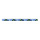 Blue hydrangea ribbon with blooms and leaves scattered along satin or grosgrain ribbon. Background is light blue. Bright blue flowers make a pretty design to wrap gifts or create bows or wreaths. The image fits the thinner ribbon best.