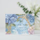 An elegant coastal wedding design featuring soft blue hydrangeas, woven nautical rope details, delicate seashell accents, and an airy ocean-toned watercolor background. The composition blends botanical romance with subtle seaside elements, creating a refined coastal look that feels timeless rather than themed.