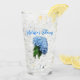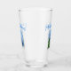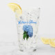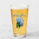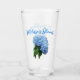 Blue hydrangea stem, cut flower image on clear glassware. Tall drinking glass has the flower image on both sides. Light blue petals and green leaves at the top of a short stem.