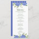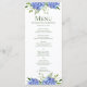 This chic and elegant, blue hydrangea engagement party menu is perfect for your tables at your engagement party. It has sections for first course, second course, 3 entrée options and dessert. The templates are super easy to use, so making this your own will take just a minute or two. Definitely place one on every place setting at your party so that your guests will know the amazing food options you have made available for them and so that they can effortlessly order their choices as your dinner service progresses.