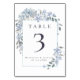 An elegant wedding reception table number in blue and white featuring hydrangeas and leaves. Edit number for each table and add to cart separately. Personalise with your wedding details.