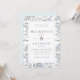 A pretty and elegant wedding invitation featuring a watercolor floral pattern background of blue hydrangeas and leaves on a white background, overlaid with a double rectangle frame. Wedding details are in slate blue charcoal serif font. The reverse is in solid light blue.