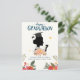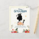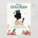 A vertical card design with a white background. At the top, the words "happy GRADUATION" are written in a mix of cursive and bold fonts. The central image is a silhouette of a female graduate with her hair in a bun, wearing a cap and holding a diploma. A bouquet of large, pink-orange flowers is placed below her neck, and abstract gold stars are scattered around the top. The bottom features a quote: ""Incredible work! The world is waiting for you to do great things."" A colourful, detailed floral border is at the very bottom.