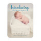 "Introducing" in hand lettering and calligraphy script font in blue, featuring vertical photo of newborn baby. Elegant and modern birth announcement.