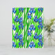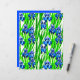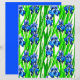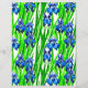 Paper in a watercolor pattern of indigo blue irises and green leaves, against a white background