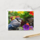 This colourful postcard features a blue jay who has landed on a porch deck surrounded by flowers. The blue, grey, white and black coloration of the bird is set off by a riot of colour. There is a decorative teapot with orange and yellow nasturtiums and a purple petunia. Green leaves complete this kaleidoscope of colours.