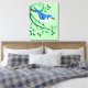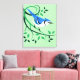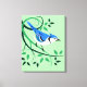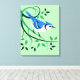 Decorative canvas bird art with customisable background colour of Blue Jay perched on stylised branches and leaves