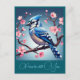 A STUNNING BLUE JAY SITS PROUDLY ON A DELICATE CHERRY TREE BRANCH, SURROUNDED BY LUSH GREEN LEAVES AND VIBRANT PINK BLOSSOMS.