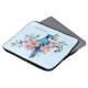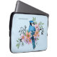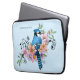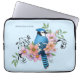 A blue jay bird surrounded by pink, purple and peach pastel coloured spring flowers set against a light blue backdrop.