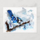 traditional watercolor painting of a little blue jay bird sitting on a branch with purple berries in the cold winter.