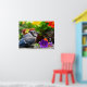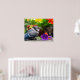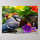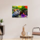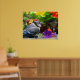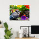 This colourful poster features a blue jay who has landed on a porch deck surrounded by flowers. The blue, grey, white and black coloration of the bird is set off by a riot of colour. There is a decorative teapot with orange and yellow nasturtiums and a purple petunia. Green leaves complete this kaleidoscope of colours.