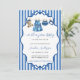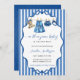 Charming watercolor illustration featuring adorable baby girl items hanging on a clothesline, including a sweet teddy bear with blue bow, denim dress, ruffled bloomers, and headband in soft shades of blue. 👶 The classic blue and white striped background adds a timeless, cozy feel, while the elegant wavy frame brings a touch of sophistication and whimsy. 🎀 Perfect for a denim-themed celebration with its delicate, hand-painted details evoking joy and anticipation in a playful yet refined style. ✨