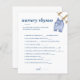 Part of the Blue Jean Baby collection, this Baby Nursery Rhymes game is simple + fun for all ages! Just complete as many nursery rhymes as you can. All text is customisable to match the details of your occasion perfectly ↣ just click the ‘Personalise’ button. Mix with other games within the collection for a full day of fun! *THE ANSWERS ARE SHOWN IN "" IN THE 'PERSONALIZE' SCREEN.